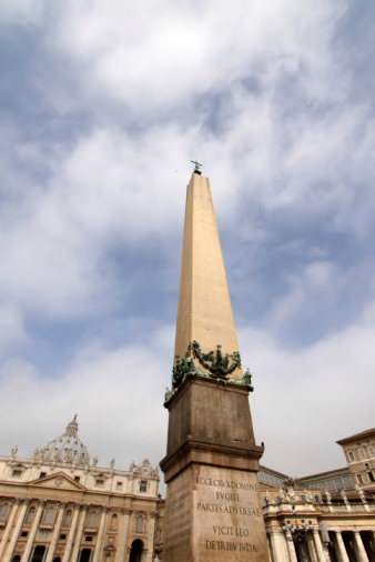 According to the website of St. Peter’s Basilica, the obelisk standing in St. Peter’s Square came from Heliopolis, Egypt where it was believed to have been built by the Pharaoh Mencares in 1835 B.C. in honor of the sun. It is hewn from a single block of pink granite and stands 25.31 m high on a base that is 8.25 m wide. It was brought to Rome by Caligula in 37 B.C. and intended to be erected in the Vatican Circus.